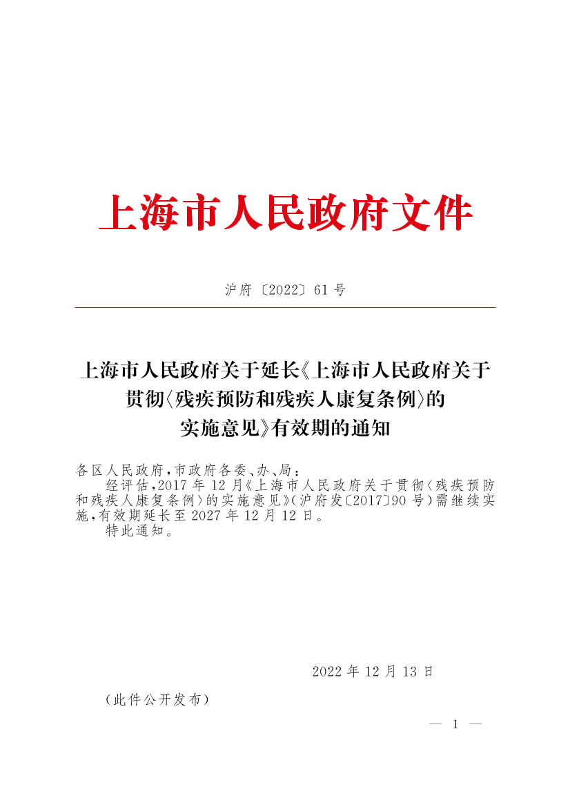 ??經(jīng)評(píng)估,2017年12月《上海市人民政府關(guān)于貫徹〈殘疾預(yù)防和殘疾人康復(fù)條例〉的實(shí)施意見》(滬府發(fā)〔2017〕90號(hào))需繼續(xù)實(shí)施,有效期延長(zhǎng)至2027年12月12日。