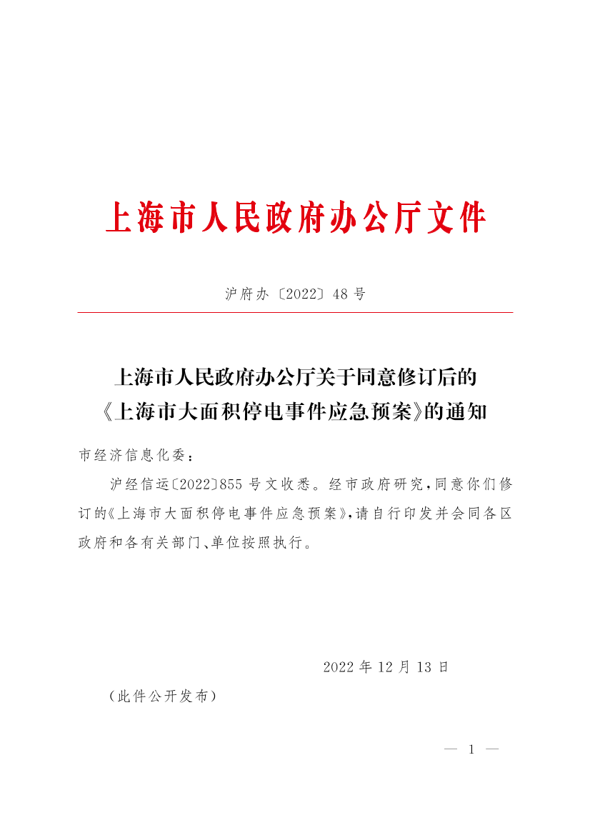 ??滬經(jīng)信運〔2022〕855號文收悉。經(jīng)市政府研究,同意你們修訂的《上海市大面積停電事件應(yīng)急預(yù)案》,請自行印發(fā)并會同各區(qū)政府和各有關(guān)部門、單位按照執(zhí)行。