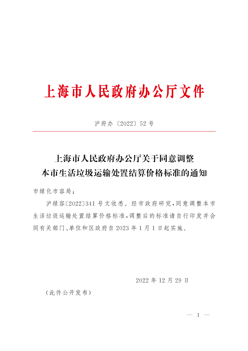 上海市人民政府辦公廳關(guān)于同意調(diào)整本市生活垃圾運(yùn)輸處置結(jié)算價(jià)格標(biāo)準(zhǔn)的通知