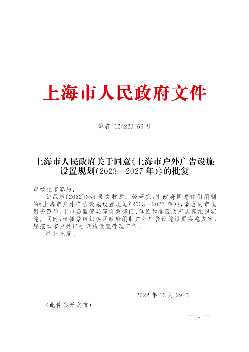 上海市人民政府關(guān)于同意《上海市戶外廣告設(shè)施設(shè)置規(guī)劃(2023—2027年)》的批復(fù)