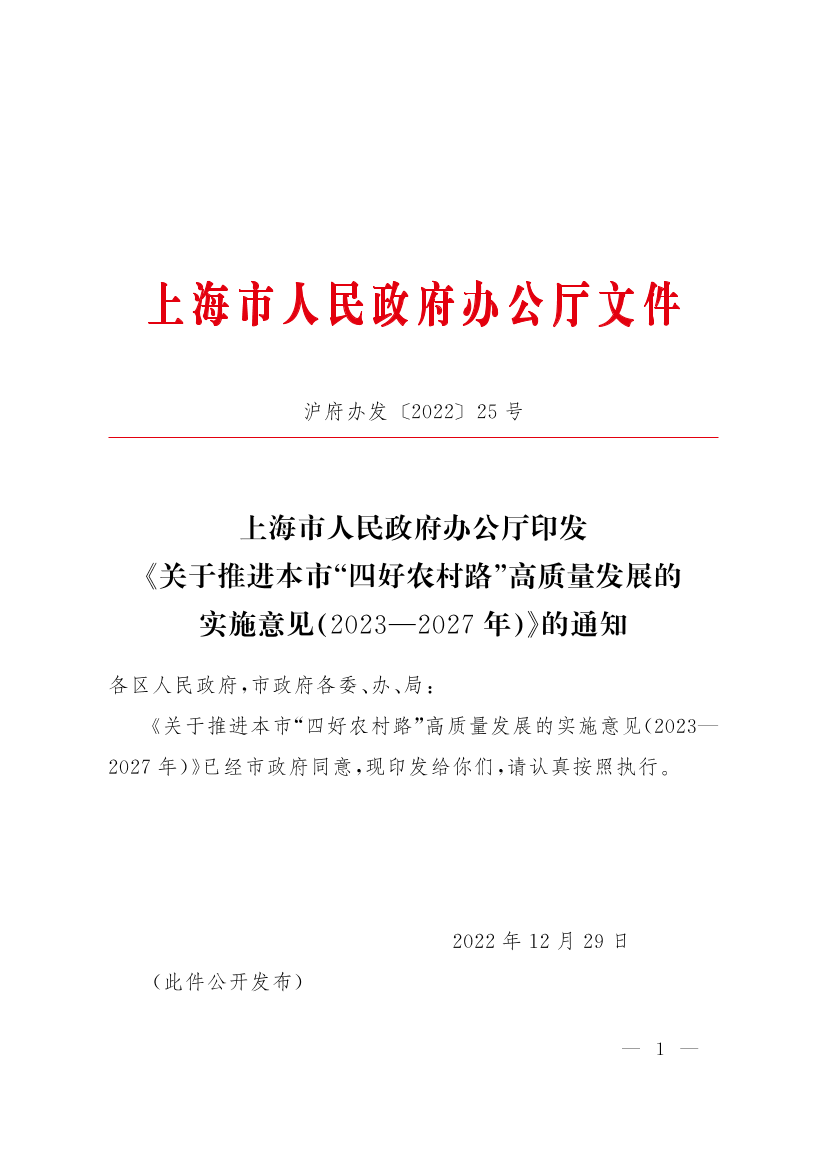 上海市人民政府辦公廳印發(fā)《關(guān)于推進(jìn)本市“四好農(nóng)村路”高質(zhì)量發(fā)展的實(shí)施意見(jiàn)(2023—2027年)》的通知