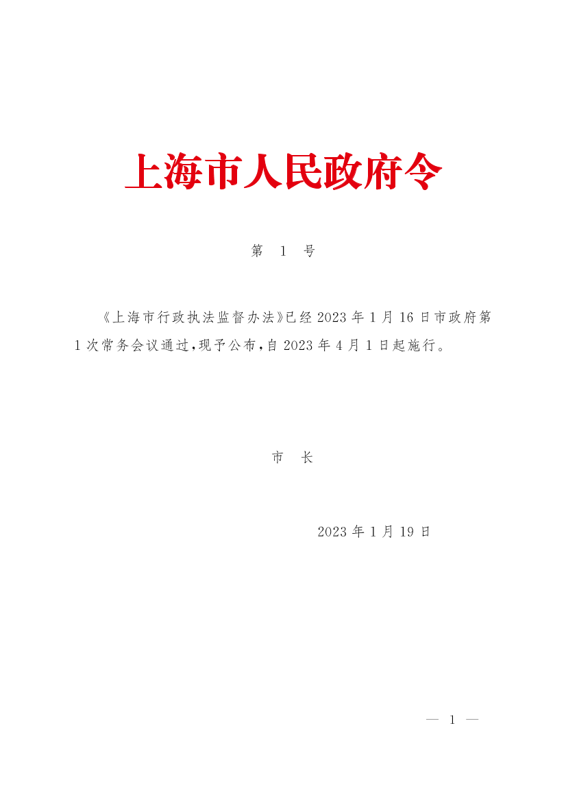 ??《上海市行政執(zhí)法監(jiān)督辦法》已經(jīng)2023年1月16日市政府第1次常務(wù)會議通過,現(xiàn)予公布,自2023年4月1日起施行。