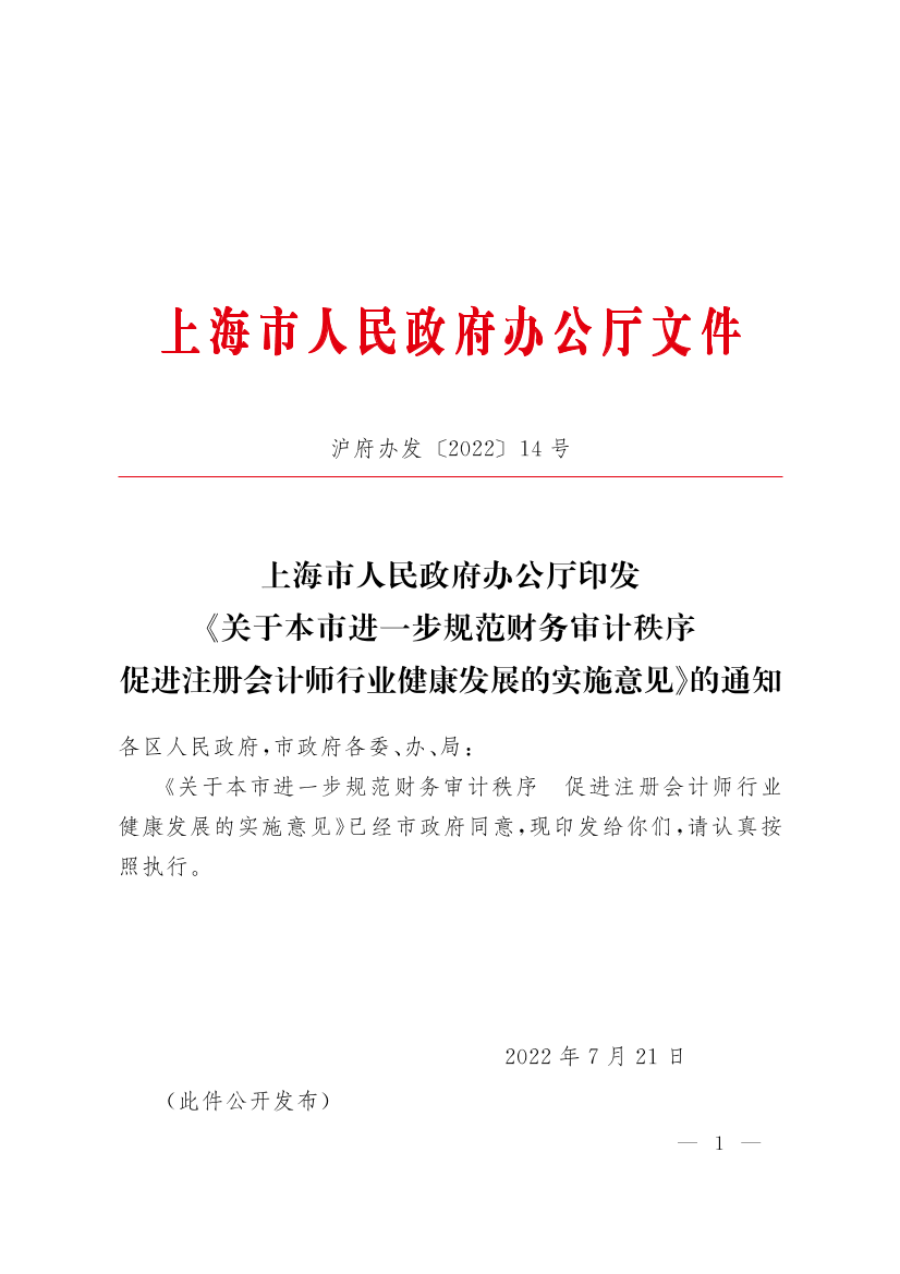 上海市人民政府辦公廳印發(fā)《關(guān)于本市進一步規(guī)范財務(wù)審計秩序促進注冊會計師行業(yè)健康發(fā)展的實施意見》的通知