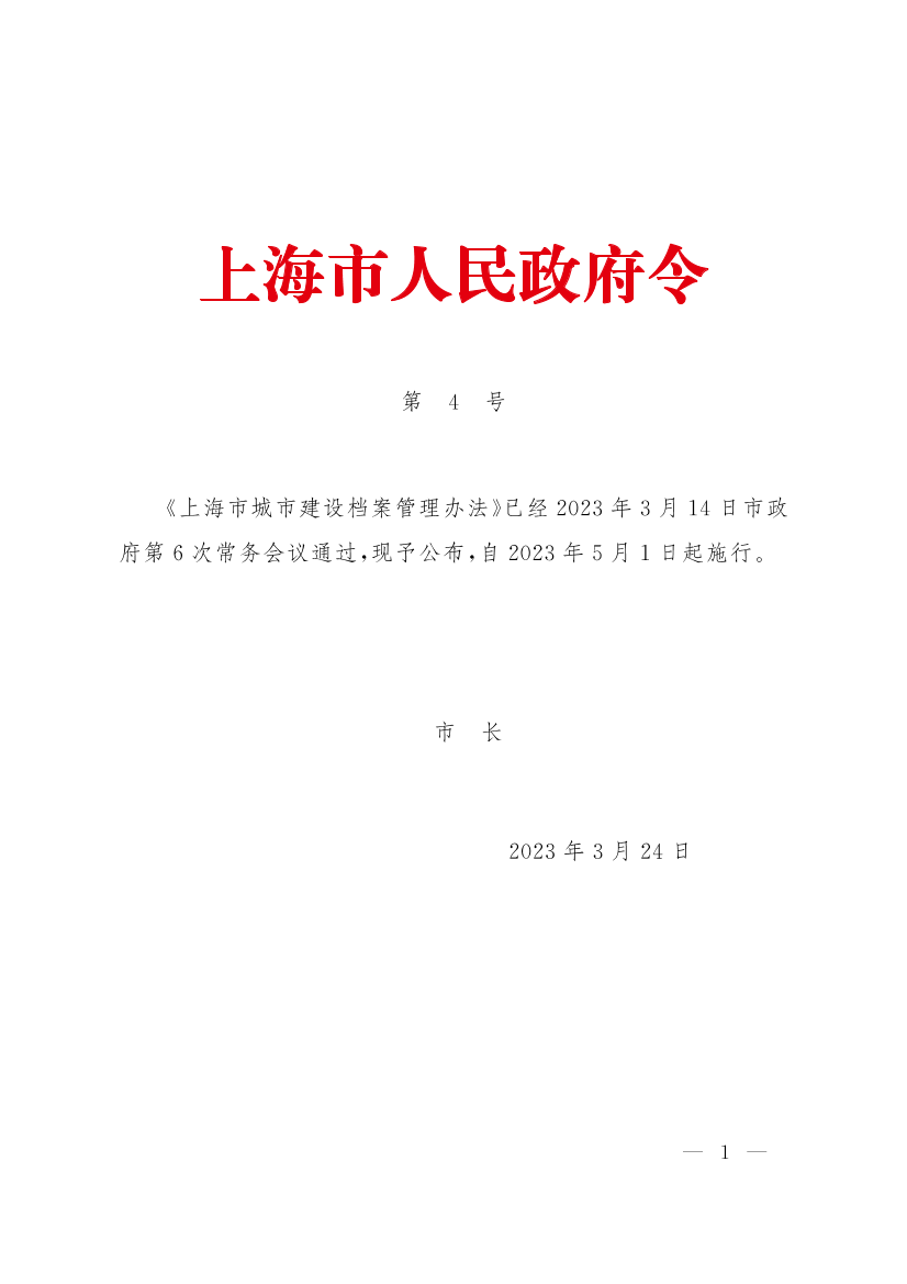 ??《上海市城市建設(shè)檔案管理辦法》已經(jīng)2023年3月14日市政府第6次常務(wù)會(huì)議通過(guò),現(xiàn)予公布,自2023年5月1日起施行。