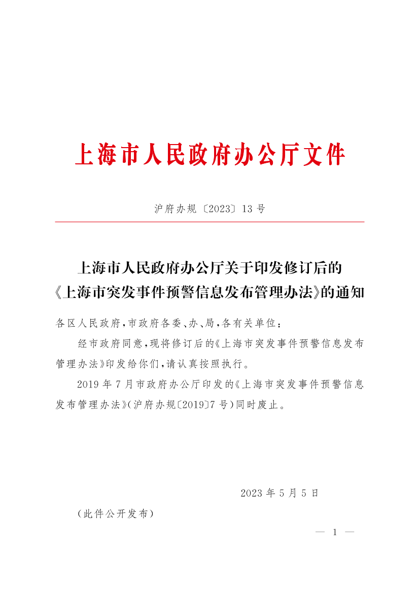 ??2019年7月市政府辦公廳印發(fā)的《上海市突發(fā)事件預警信息發(fā)布管理辦法》(滬府辦規(guī)〔2019〕7號)同時廢止。