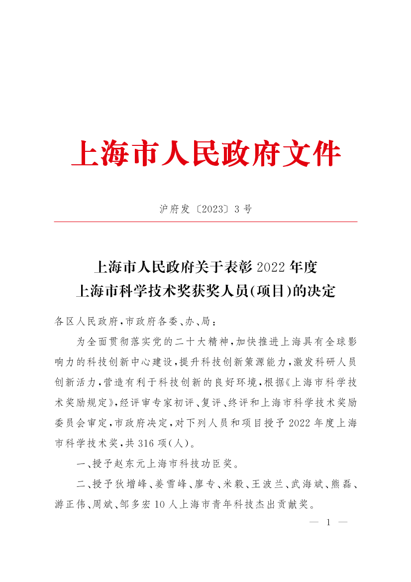 上海市人民政府關于表彰2022年度上海市科學技術獎獲獎人員(項目)的決定