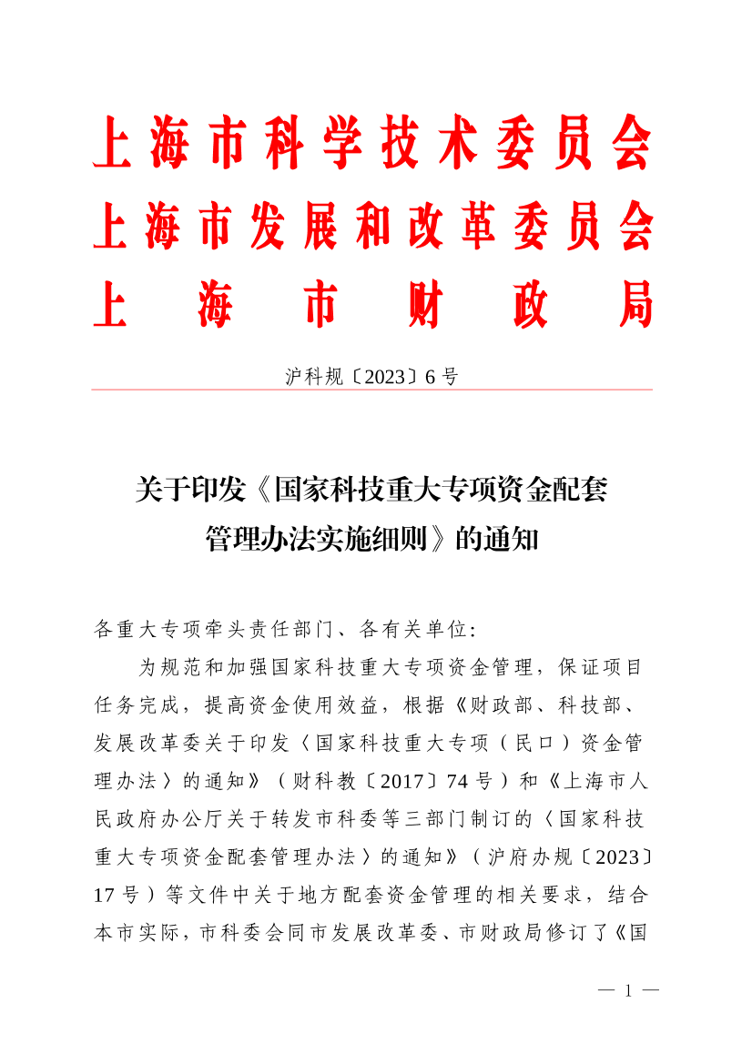 ??為規(guī)范和加強國家科技重大專項資金管理,保證項目任務(wù)完成,提高資金使用效益,根據(jù)《財政部、科技部、發(fā)展改革委關(guān)于印發(fā)〈國家科技重大專項(民口)資金管理辦法〉的通知》(財科教〔2017〕74號)和《上海市人民政府辦公廳關(guān)于轉(zhuǎn)發(fā)市科委等三部門制訂的〈國家科技重大專項資金配套管理辦法〉的通知》(滬府辦規(guī)〔2023〕17號)等文件中關(guān)于地方配套資金管理的相關(guān)要求,結(jié)合本市實際,市科委會同市發(fā)展改革委、市財政局修訂了《國家科技重大專項資金配套管理辦法實施細(xì)則》,現(xiàn)予印發(fā),請遵照執(zhí)行。