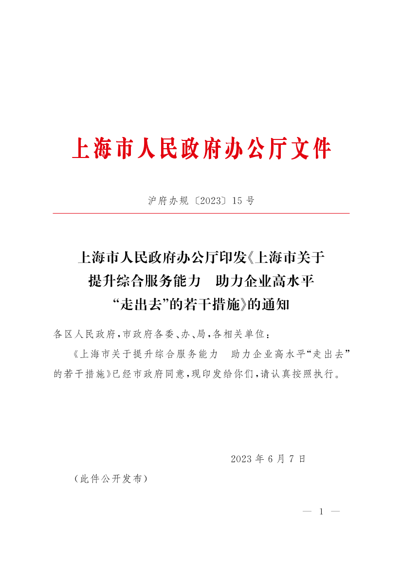 ??《上海市關(guān)于提升綜合服務(wù)能力助力企業(yè)高水平“走出去”的若干措施》已經(jīng)市政府同意,現(xiàn)印發(fā)給你們,請(qǐng)認(rèn)真按照?qǐng)?zhí)行。