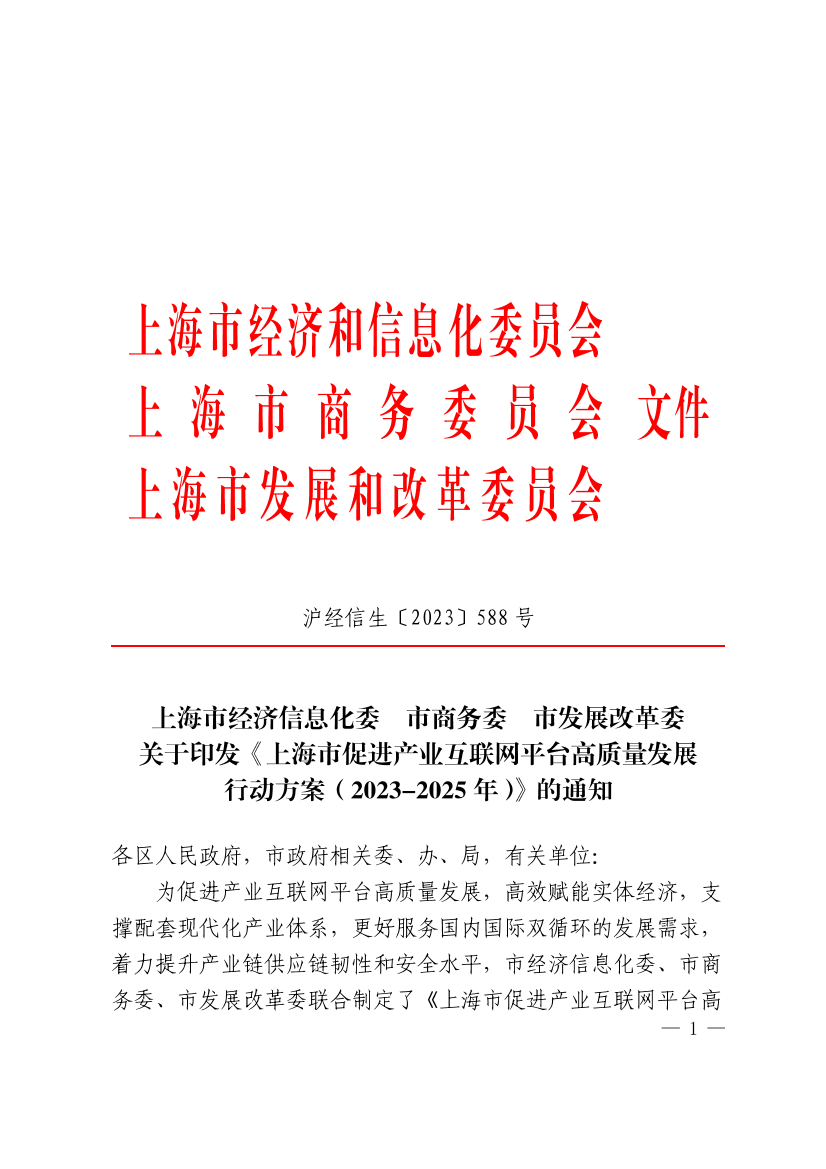 ??為促進產(chǎn)業(yè)互聯(lián)網(wǎng)平臺高質量發(fā)展,高效賦能實體經(jīng)濟,支撐配套現(xiàn)代化產(chǎn)業(yè)體系,更好服務國內國際雙循環(huán)的發(fā)展需求,著力提升產(chǎn)業(yè)鏈供應鏈韌性和安全水平,市經(jīng)濟信息化委、市商務委、市發(fā)展改革委聯(lián)合制定了《上海市促進產(chǎn)業(yè)互聯(lián)網(wǎng)平臺高質量發(fā)展行動方案(2023-2025年)》。經(jīng)市政府同意,現(xiàn)印發(fā)給你們,請認真貫徹執(zhí)行。