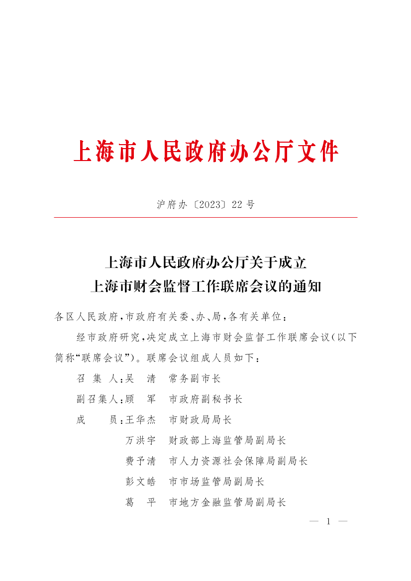 上海市人民政府辦公廳關(guān)于成立上海市財會監(jiān)督工作聯(lián)席會議的通知