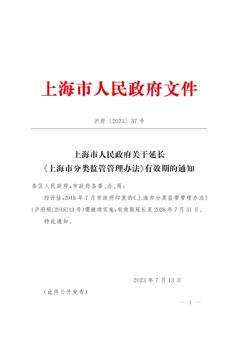 ??經評估,2018年7月市政府印發(fā)的《上海市分類監(jiān)管管理辦法》(滬府規(guī)〔2018〕13號)需繼續(xù)實施,有效期延長至2028年7月31日。