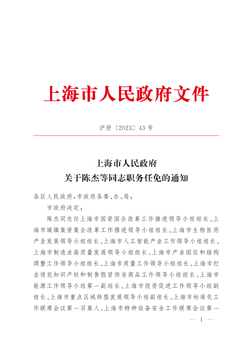 上海市人民政府關(guān)于陳杰等同志職務(wù)任免的通知