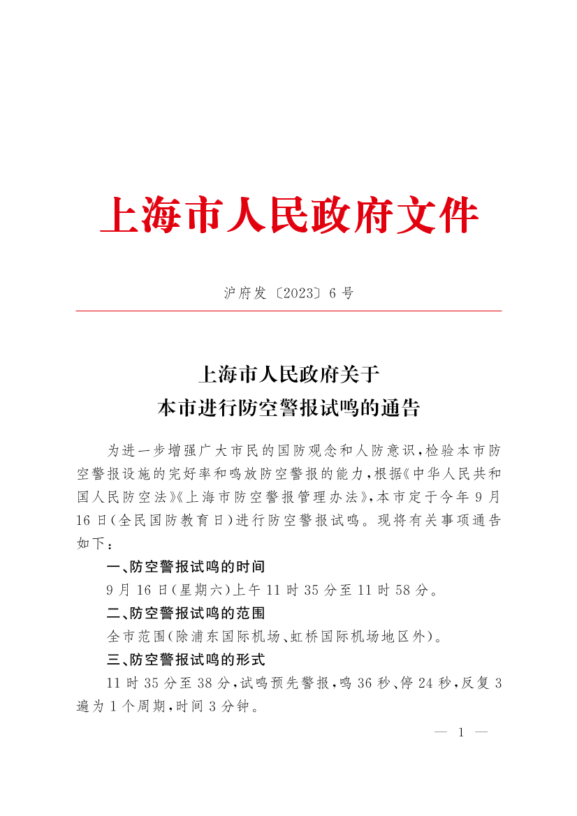 為進(jìn)一步增強(qiáng)廣大市民的國(guó)防觀念和人防意識(shí),檢驗(yàn)本市防空警報(bào)設(shè)施的完好率和鳴放防空警報(bào)的能力,根據(jù)《中華人民共和國(guó)人民防空法》《上海市防空警報(bào)管理辦法》,本市定于今年9月16日(全民國(guó)防教育日)進(jìn)行防空警報(bào)試?guó)Q?,F(xiàn)將有關(guān)事項(xiàng)通告如下: