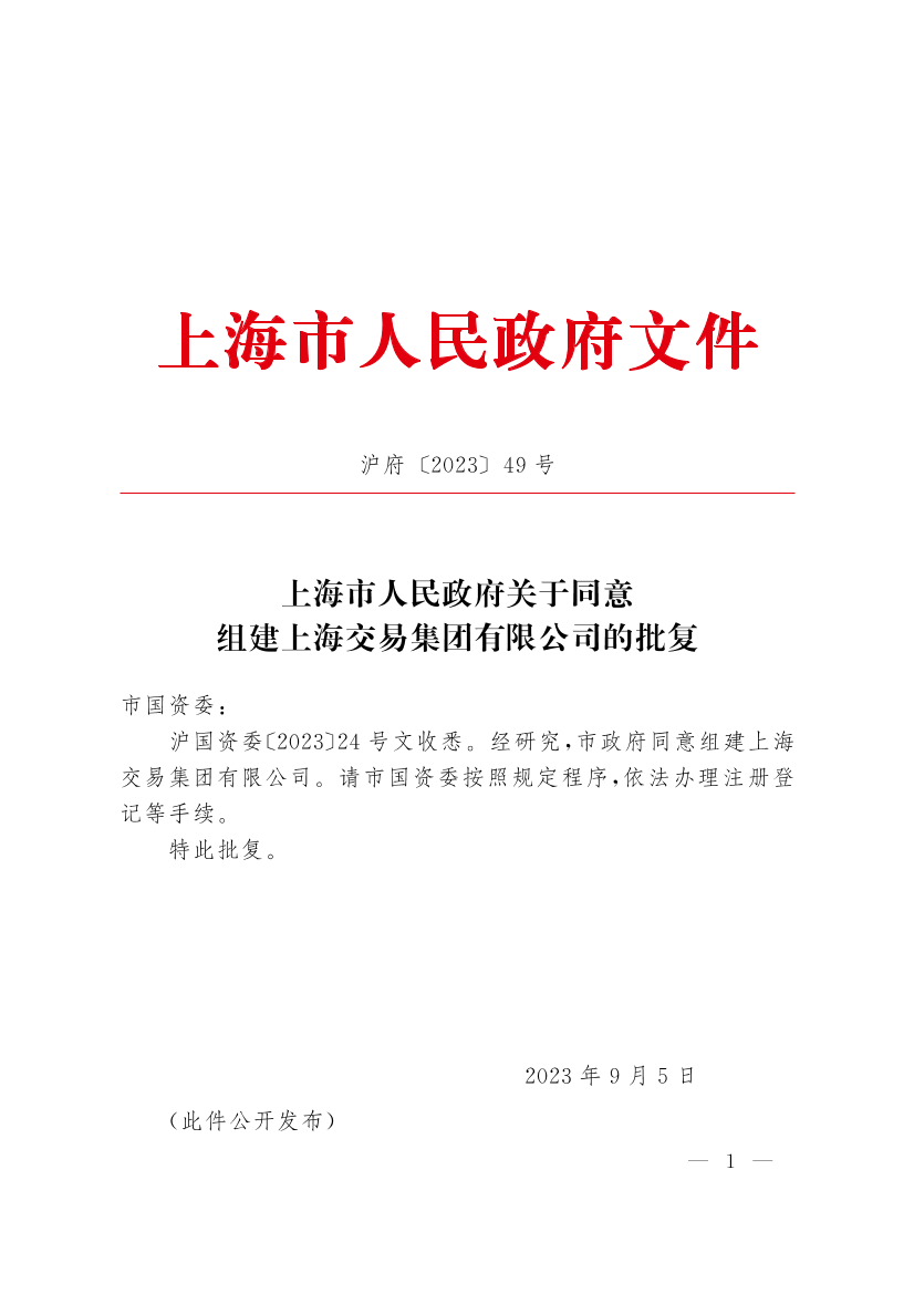 ??滬國資委〔2023〕24號文收悉。經(jīng)研究,市政府同意組建上海交易集團有限公司。請市國資委按照規(guī)定程序,依法辦理注冊登記等手續(xù)。