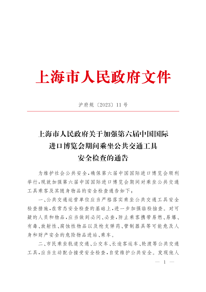 上海市人民政府關(guān)于加強(qiáng)第六屆中國(guó)國(guó)際進(jìn)口博覽會(huì)期間乘坐公共交通工具安全檢查的通告