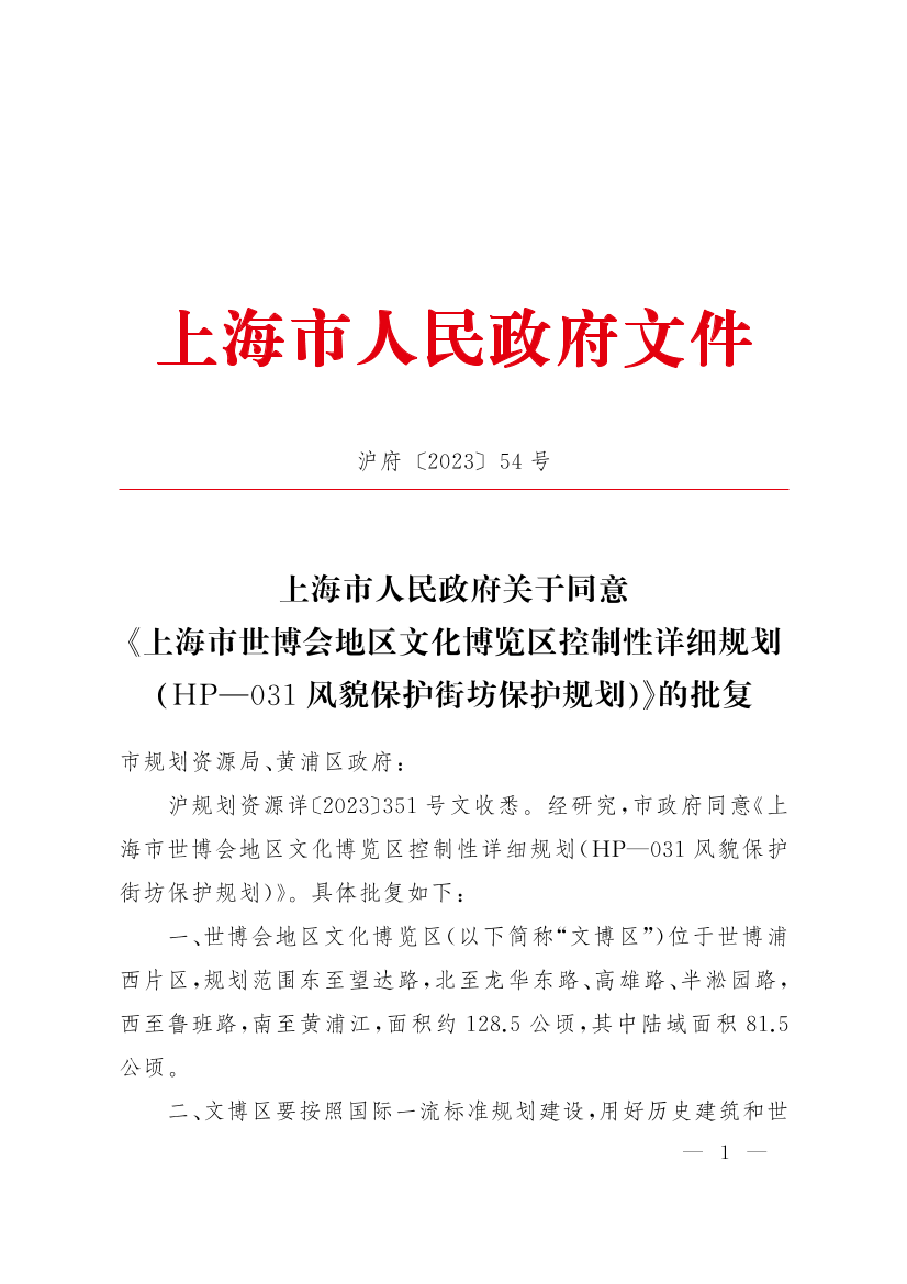 ??滬規(guī)劃資源詳〔2023〕351號(hào)文收悉。經(jīng)研究,市政府同意《上海市世博會(huì)地區(qū)文化博覽區(qū)控制性詳細(xì)規(guī)劃(HP—031風(fēng)貌保護(hù)街坊保護(hù)規(guī)劃)》。具體批復(fù)如下: