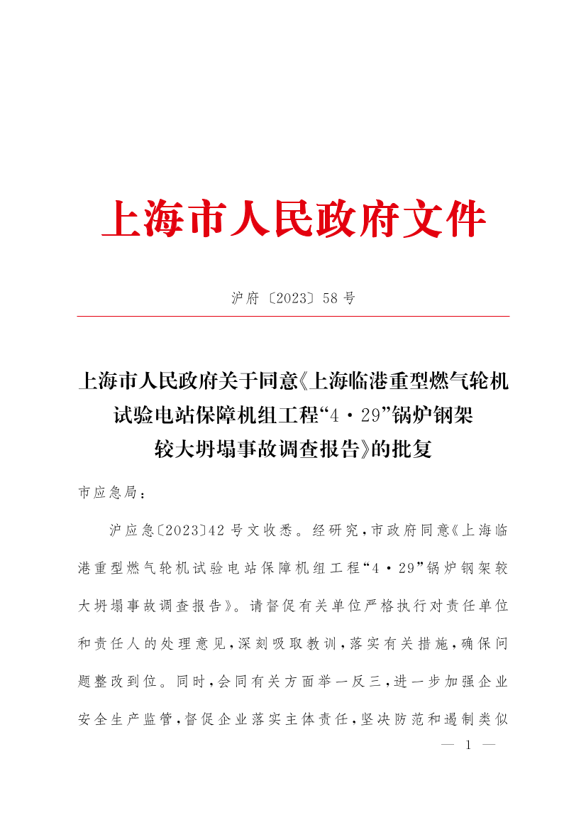 ??滬應(yīng)急〔2023〕42號(hào)文收悉。經(jīng)研究,市政府同意《上海臨港重型燃?xì)廨啓C(jī)試驗(yàn)電站保障機(jī)組工程“4·29”鍋爐鋼架較大坍塌事故調(diào)查報(bào)告》。請(qǐng)督促有關(guān)單位嚴(yán)格執(zhí)行對(duì)責(zé)任單位和責(zé)任人的處理意見,深刻吸取教訓(xùn),落實(shí)有關(guān)措施,確保問題整改到位。同時(shí),會(huì)同有關(guān)方面舉一反三,進(jìn)一步加強(qiáng)企業(yè)安全生產(chǎn)監(jiān)管,督促企業(yè)落實(shí)主體責(zé)任,堅(jiān)決防范和遏制類似事故發(fā)生。