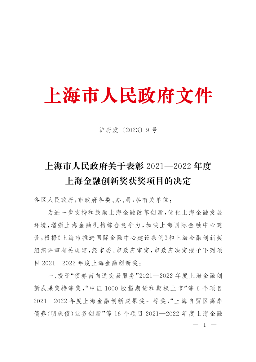 上海市人民政府關(guān)于表彰2021—2022年度上海金融創(chuàng)新獎(jiǎng)獲獎(jiǎng)項(xiàng)目的決定