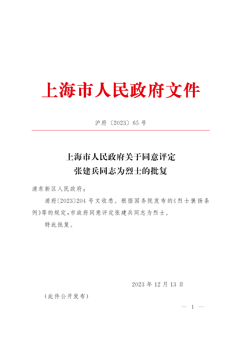 ??浦府〔2023〕204號文收悉。根據(jù)國務院發(fā)布的《烈士褒揚條例》等的規(guī)定,市政府同意評定張建兵同志為烈士。