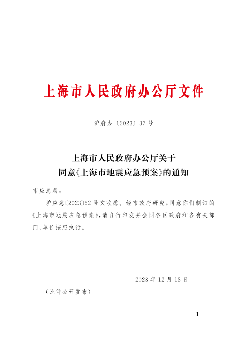 ??滬應(yīng)急〔2023〕52號文收悉。經(jīng)市政府研究,同意你們制訂的《上海市地震應(yīng)急預(yù)案》,請自行印發(fā)并會(huì)同各區(qū)政府和各有關(guān)部門、單位按照執(zhí)行。