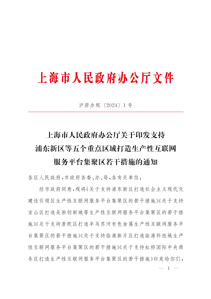 上海市人民政府辦公廳關(guān)于印發(fā)支持浦東新區(qū)等五個重點區(qū)域打造生產(chǎn)性互聯(lián)網(wǎng)服務(wù)平臺集聚區(qū)若干措施的通知