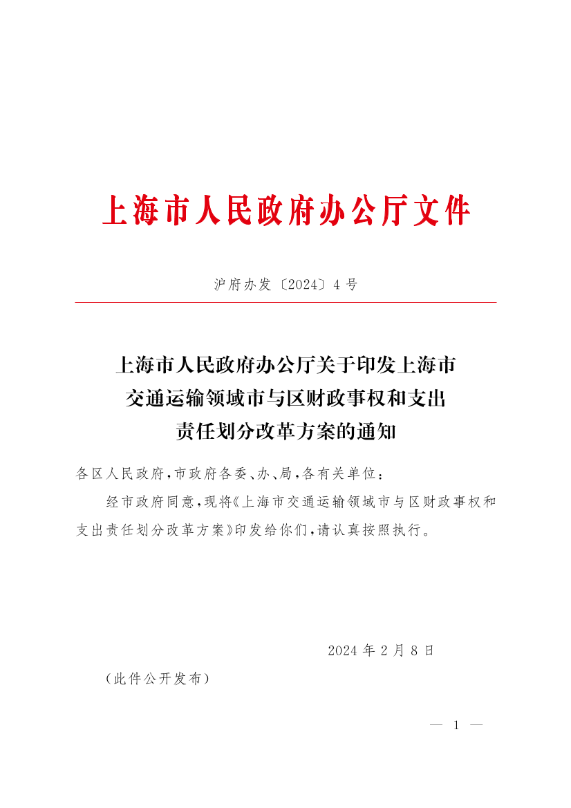 上海市人民政府辦公廳關于印發(fā)上海市交通運輸領域市與區(qū)財政事權和支出責任劃分改革方案的通知