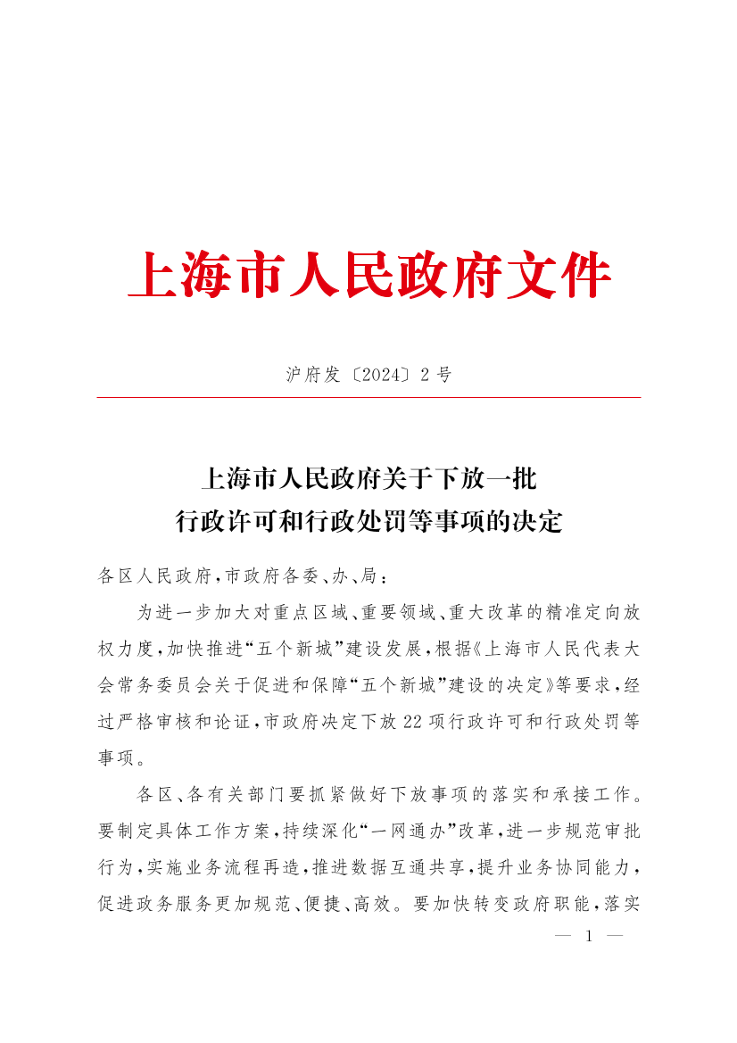 ??為進(jìn)一步加大對重點區(qū)域、重要領(lǐng)域、重大改革的精準(zhǔn)定向放權(quán)力度,加快推進(jìn)“五個新城”建設(shè)發(fā)展,根據(jù)《上海市人民代表大會常務(wù)委員會關(guān)于促進(jìn)和保障“五個新城”建設(shè)的決定》等要求,經(jīng)過嚴(yán)格審核和論證,市政府決定下放22項行政許可和行政處罰等事項。