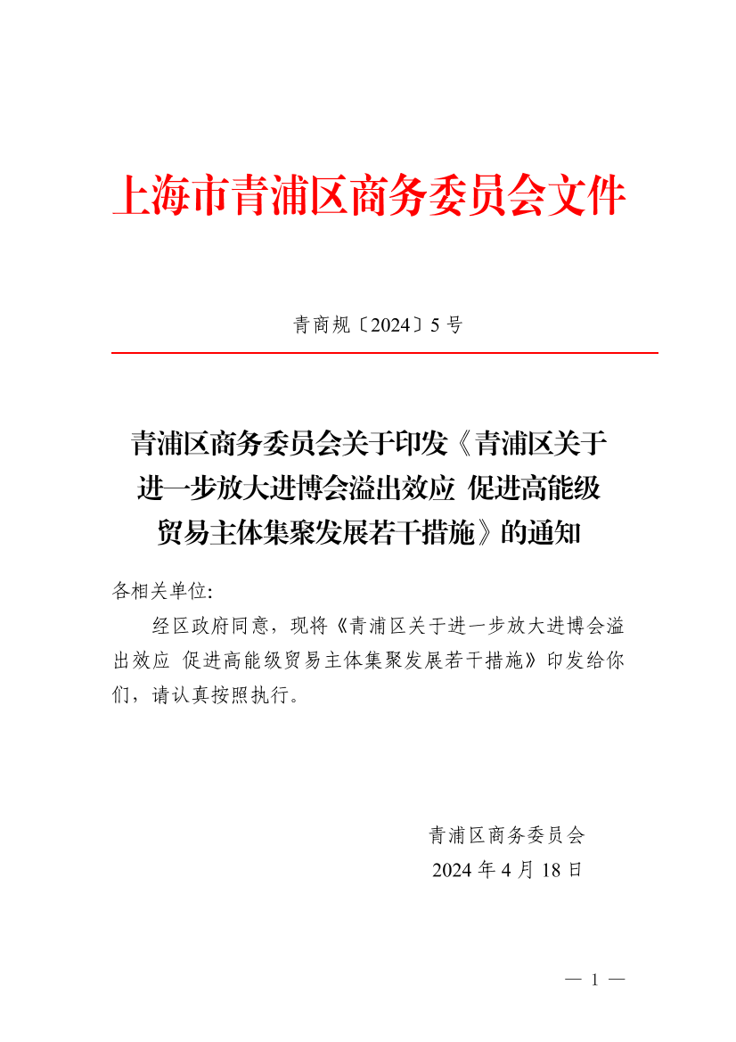 關(guān)于印發(fā)《青浦區(qū)關(guān)于進(jìn)一步放大進(jìn)博會(huì)溢出效應(yīng) 促進(jìn)高能級(jí)貿(mào)易主體集聚發(fā)展若干措施》的通知
