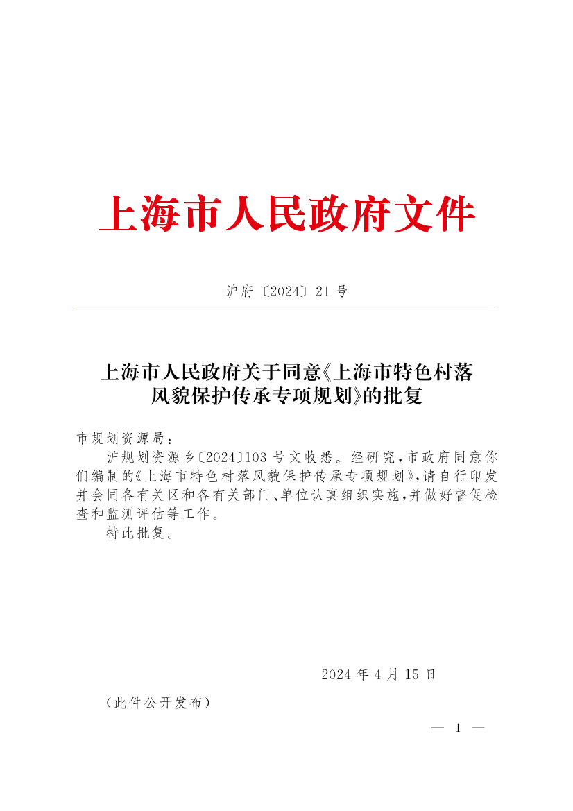 上海市人民政府關(guān)于同意《上海市特色村落風(fēng)貌保護(hù)傳承專(zhuān)項(xiàng)規(guī)劃》的批復(fù)