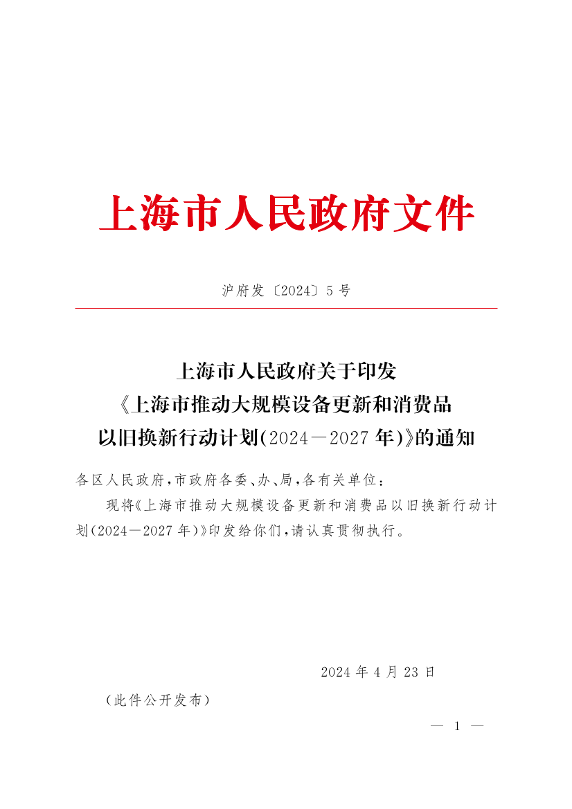 ??現(xiàn)將《上海市推動大規(guī)模設備更新和消費品以舊換新行動計劃(2024-2027年)》印發(fā)給你們,請認真貫徹執(zhí)行。