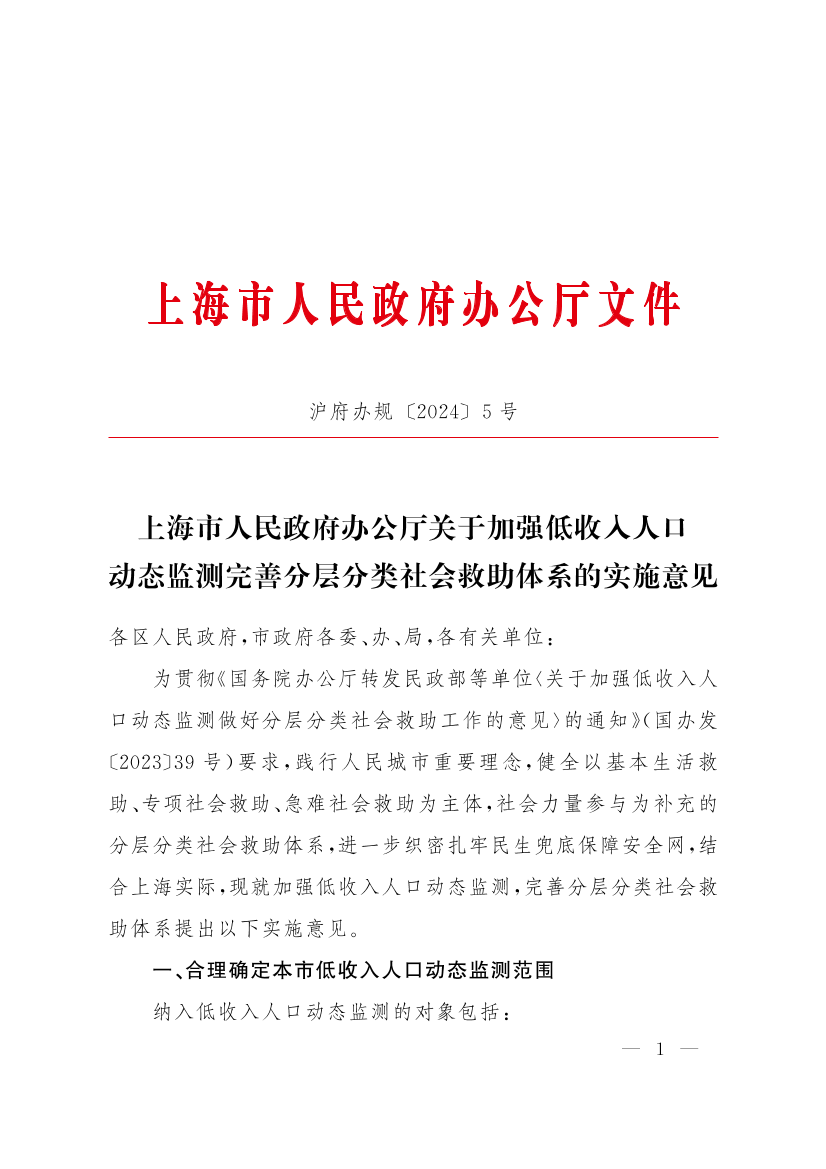 上海市人民政府辦公廳關(guān)于加強(qiáng)低收入人口動(dòng)態(tài)監(jiān)測(cè)完善分層分類社會(huì)救助體系的實(shí)施意見