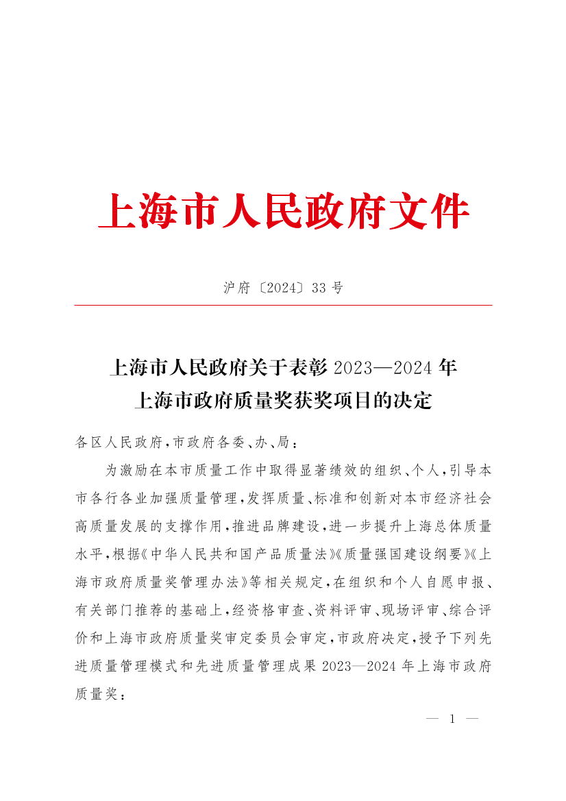 上海市人民政府關于表彰2023—2024年上海市政府質(zhì)量獎獲獎項目的決定
