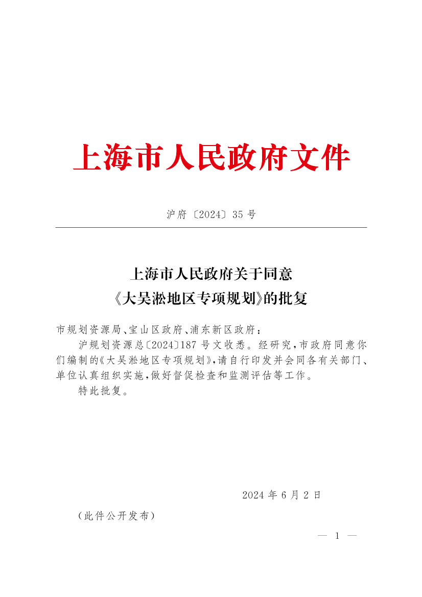 ??滬規(guī)劃資源總〔2024〕187號(hào)文收悉。經(jīng)研究,市政府同意你們編制的《大吳淞地區(qū)專項(xiàng)規(guī)劃》,請(qǐng)自行印發(fā)并會(huì)同各有關(guān)部門、單位認(rèn)真組織實(shí)施,做好督促檢查和監(jiān)測(cè)評(píng)估等工作。