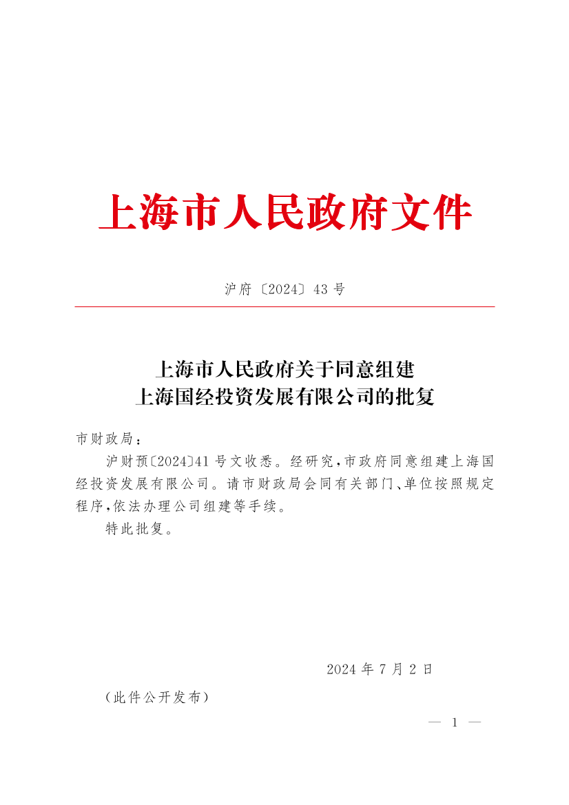 ??滬財預〔2024〕41號文收悉。經(jīng)研究,市政府同意組建上海國經(jīng)投資發(fā)展有限公司。請市財政局會同有關(guān)部門、單位按照規(guī)定程序,依法辦理公司組建等手續(xù)。