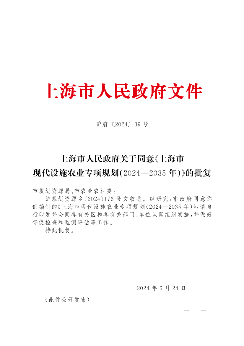 上海市人民政府關(guān)于同意《上海市現(xiàn)代設(shè)施農(nóng)業(yè)專項(xiàng)規(guī)劃(2024—2035年)》的批復(fù)
