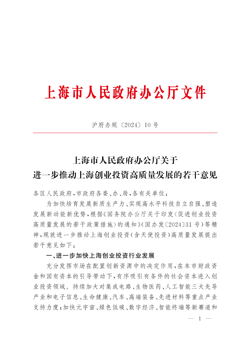 ??為加快培育發(fā)展新質(zhì)生產(chǎn)力、實(shí)現(xiàn)高水平科技自立自強(qiáng)、塑造發(fā)展新動(dòng)能新優(yōu)勢(shì),根據(jù)《國(guó)務(wù)院辦公廳關(guān)于印發(fā)〈促進(jìn)創(chuàng)業(yè)投資高質(zhì)量發(fā)展的若干政策措施〉的通知》(國(guó)辦發(fā)〔2024〕31號(hào))等精神,現(xiàn)就進(jìn)一步推動(dòng)上海創(chuàng)業(yè)投資(含天使投資)高質(zhì)量發(fā)展提出若干意見如下: