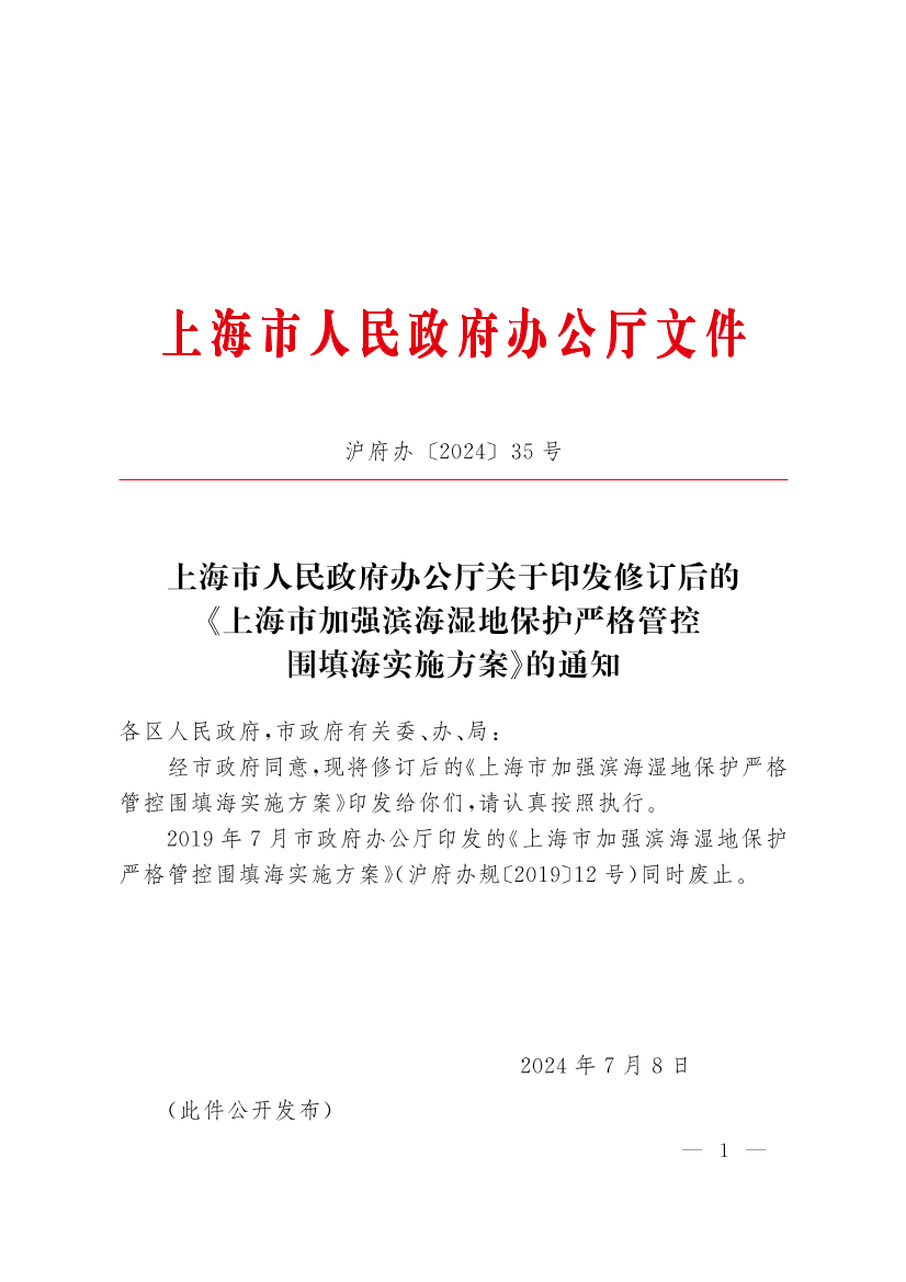 ??2019年7月市政府辦公廳印發(fā)的《上海市加強濱海濕地保護嚴格管控圍填海實施方案》(滬府辦規(guī)〔2019〕12號)同時廢止。