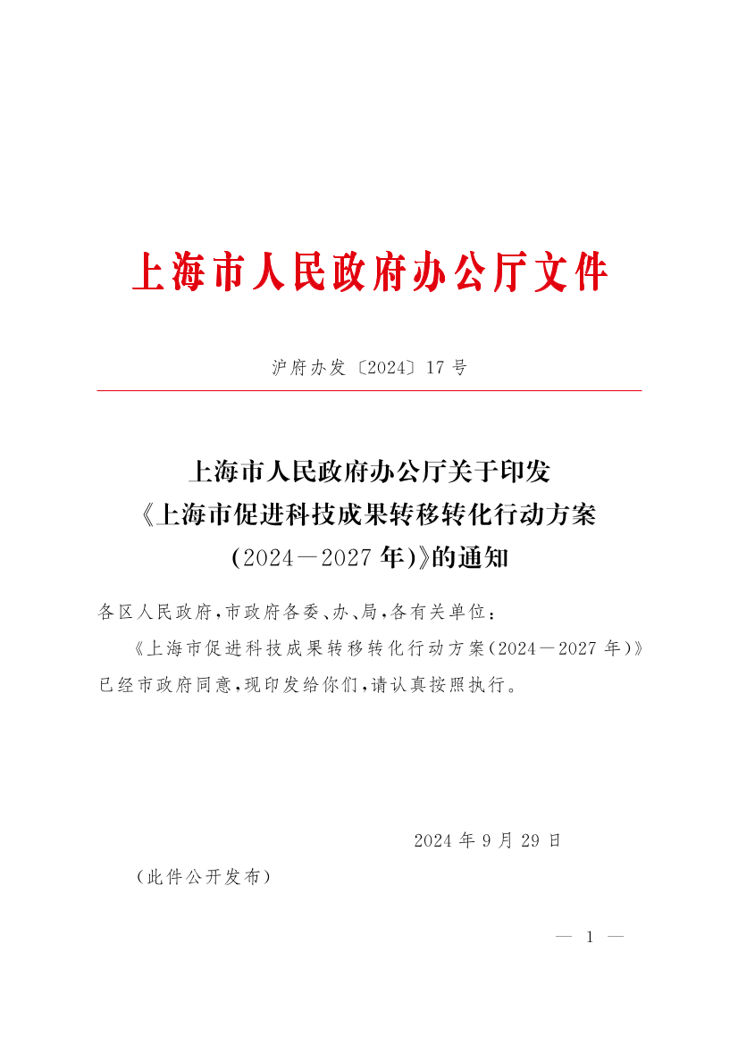 ??《上海市促進科技成果轉(zhuǎn)移轉(zhuǎn)化行動方案(2024-2027年)》已經(jīng)市政府同意,現(xiàn)印發(fā)給你們,請認(rèn)真按照執(zhí)行。