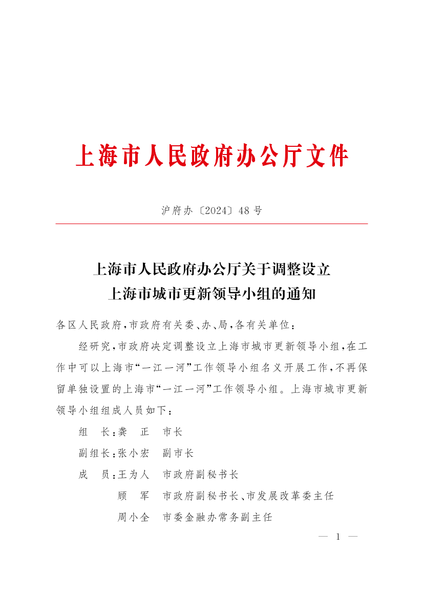 上海市人民政府辦公廳關(guān)于調(diào)整設(shè)立上海市城市更新領(lǐng)導(dǎo)小組的通知