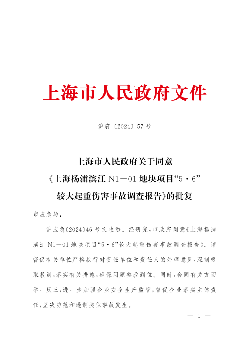 ??滬應(yīng)急〔2024〕46號文收悉。經(jīng)研究,市政府同意《上海楊浦濱江N1-01地塊項目“5·6”較大起重傷害事故調(diào)查報告》。請督促有關(guān)單位嚴(yán)格執(zhí)行對責(zé)任單位和責(zé)任人的處理意見,深刻吸取教訓(xùn),落實有關(guān)措施,確保問題整改到位。同時,會同有關(guān)方面舉一反三,進一步加強企業(yè)安全生產(chǎn)監(jiān)管,督促企業(yè)落實主體責(zé)任,堅決防范和遏制類似事故發(fā)生。