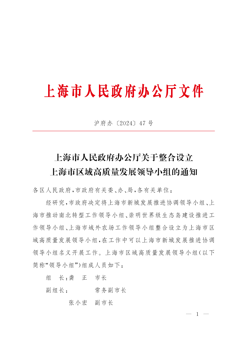 上海市人民政府辦公廳關(guān)于整合設(shè)立上海市區(qū)域高質(zhì)量發(fā)展領(lǐng)導(dǎo)小組的通知