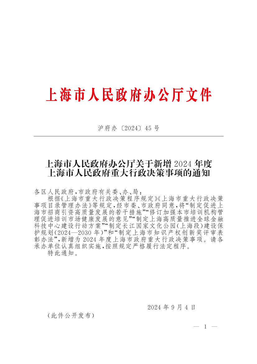 ??根據(jù)《上海市重大行政決策程序規(guī)定》《上海市重大行政決策事項目錄管理辦法》等規(guī)定,經(jīng)市委、市政府同意,將“制定促進上海市招商引資高質量發(fā)展的若干措施”“修訂加強本市培訓機構管理促進培訓市場健康發(fā)展的意見”“制定上海高質量推進全球金融科技中心建設行動方案”“制定長江國家文化公園(上海段)建設保護規(guī)劃(2024—2030年)”和“制定上海市知識產(chǎn)權創(chuàng)新獎評審表彰辦法”,新增為2024年度上海市政府重大行政決策事項。請各承辦單位認真組織實施,按照規(guī)定嚴格履行法定程序。