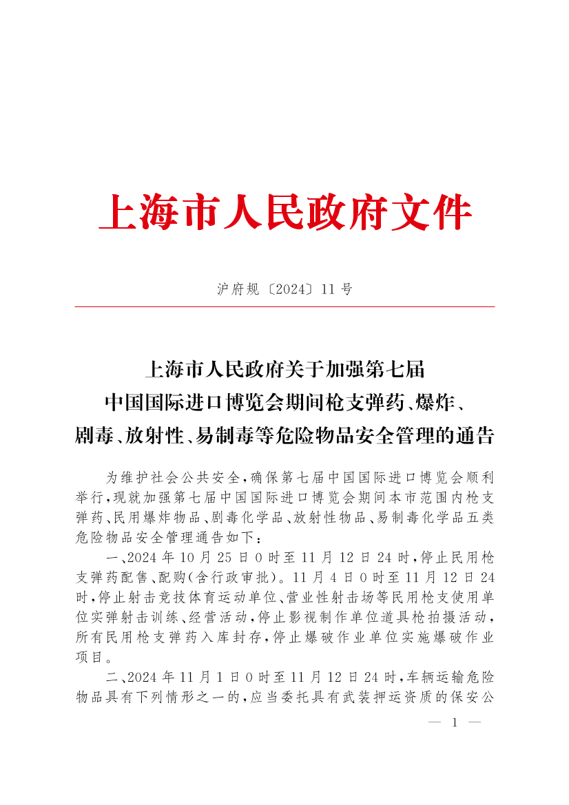 上海市人民政府關(guān)于加強(qiáng)第七屆中國(guó)國(guó)際進(jìn)口博覽會(huì)期間槍支彈藥、爆炸、劇毒、放射性、易制毒等危險(xiǎn)物品安全管理的通告