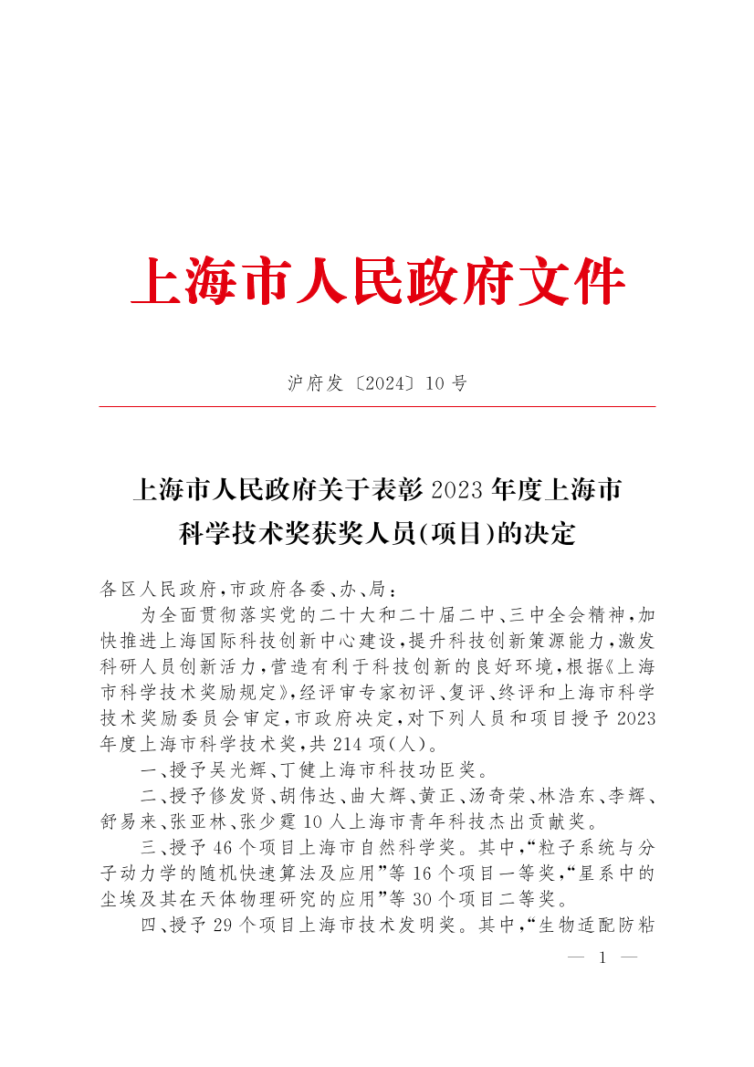上海市人民政府關(guān)于表彰2023年度上海市科學技術(shù)獎獲獎人員(項目)的決定
