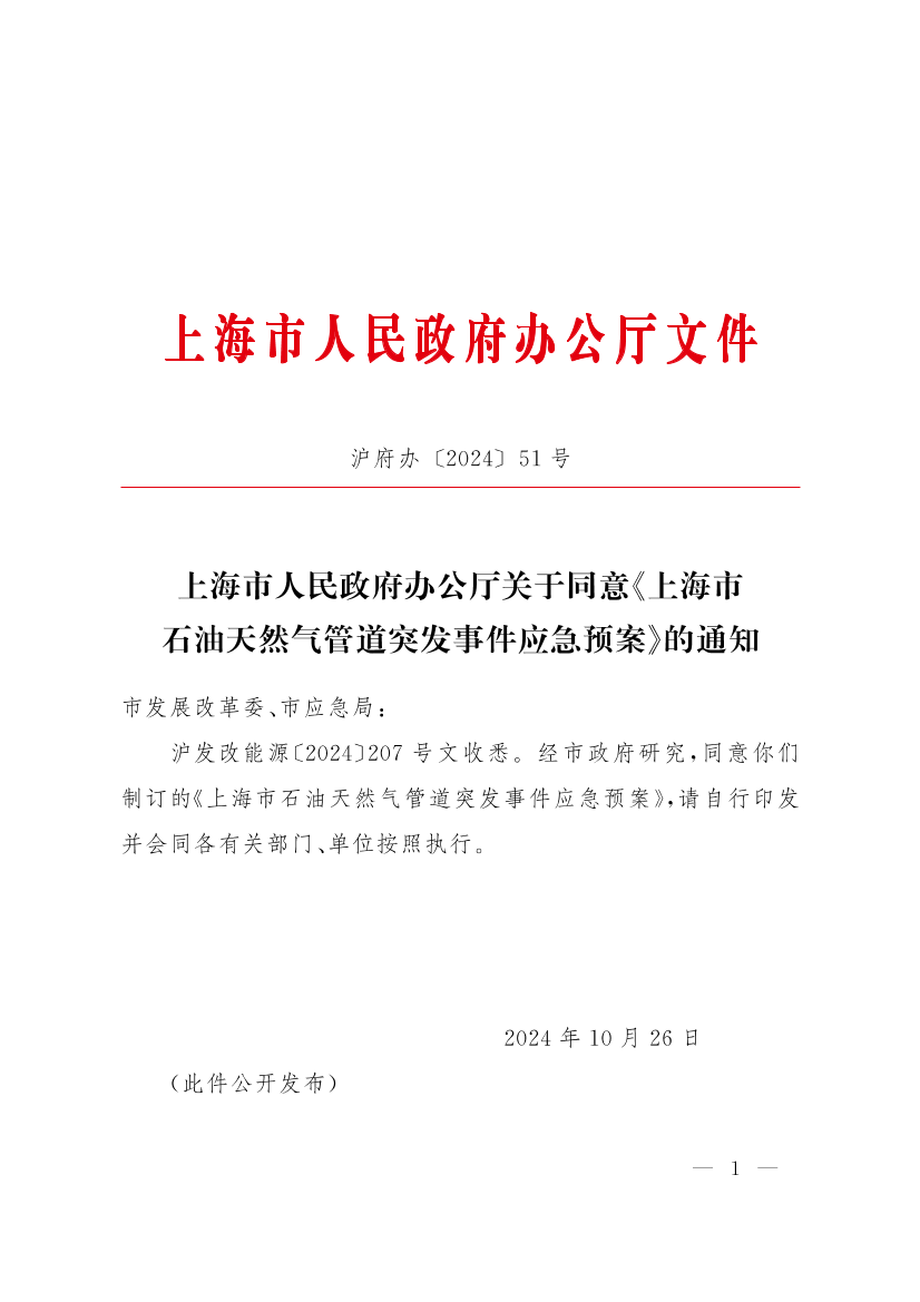 ??滬發(fā)改能源〔2024〕207號(hào)文收悉。經(jīng)市政府研究,同意你們制訂的《上海市石油天然氣管道突發(fā)事件應(yīng)急預(yù)案》,請自行印發(fā)并會(huì)同各有關(guān)部門、單位按照執(zhí)行。