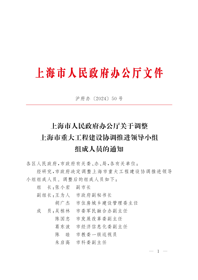 上海市人民政府辦公廳關于調整上海市重大工程建設協調推進領導小組組成人員的通知