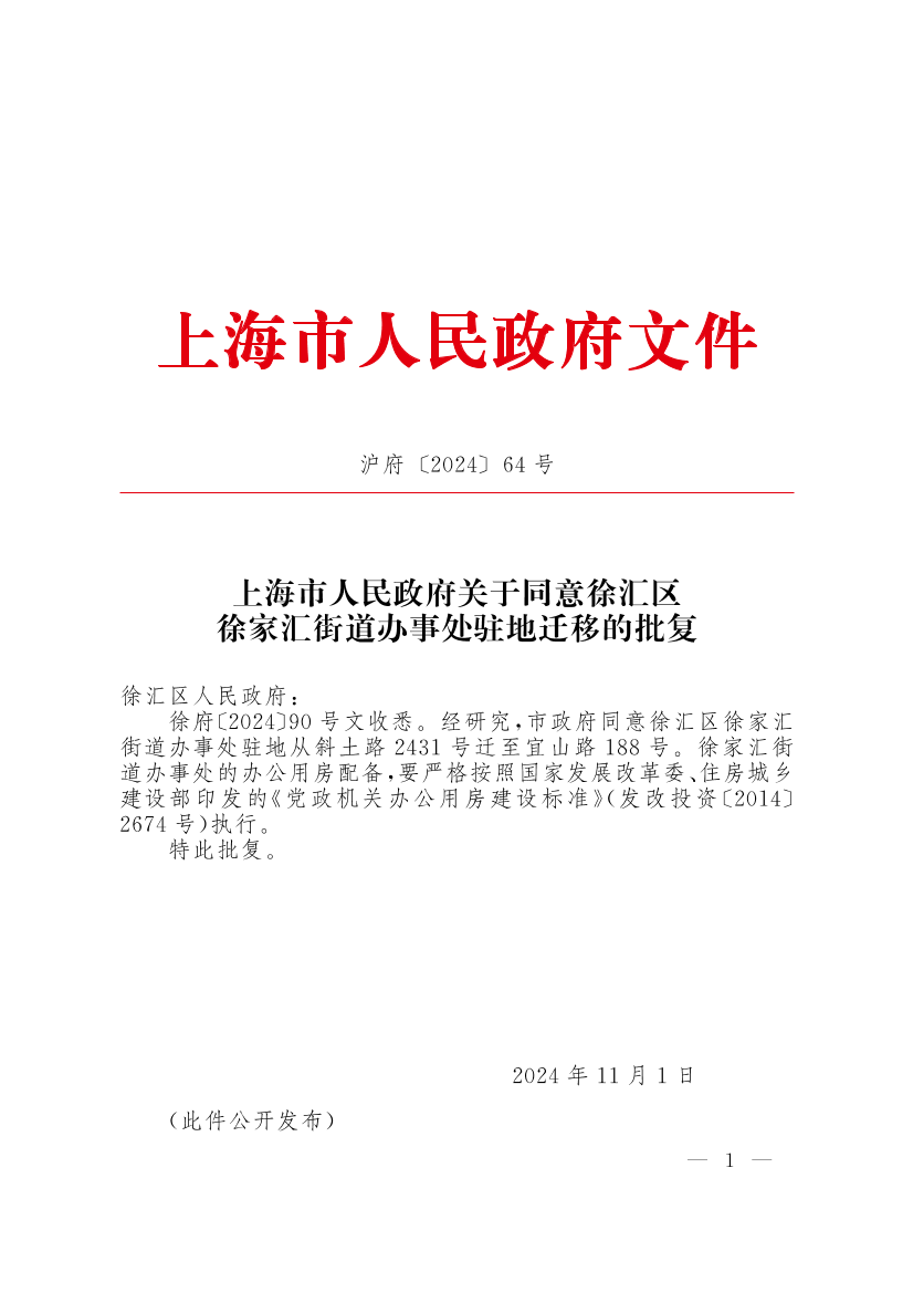 ??徐府〔2024〕90號文收悉。經(jīng)研究,市政府同意徐匯區(qū)徐家匯街道辦事處駐地從斜土路2431號遷至宜山路188號。徐家匯街道辦事處的辦公用房配備,要嚴格按照國家發(fā)展改革委、住房城鄉(xiāng)建設(shè)部印發(fā)的《黨政機關(guān)辦公用房建設(shè)標準》(發(fā)改投資〔2014〕2674號)執(zhí)行。