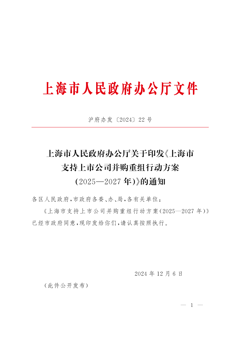 ??《上海市支持上市公司并購(gòu)重組行動(dòng)方案(2025—2027年)》已經(jīng)市政府同意,現(xiàn)印發(fā)給你們,請(qǐng)認(rèn)真按照?qǐng)?zhí)行。