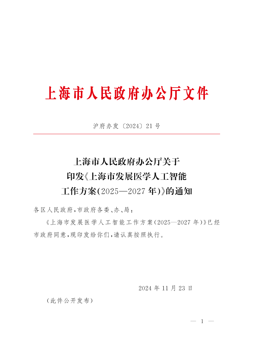 上海市人民政府辦公廳關(guān)于印發(fā)《上海市發(fā)展醫(yī)學(xué)人工智能工作方案(2025—2027年)》的通知