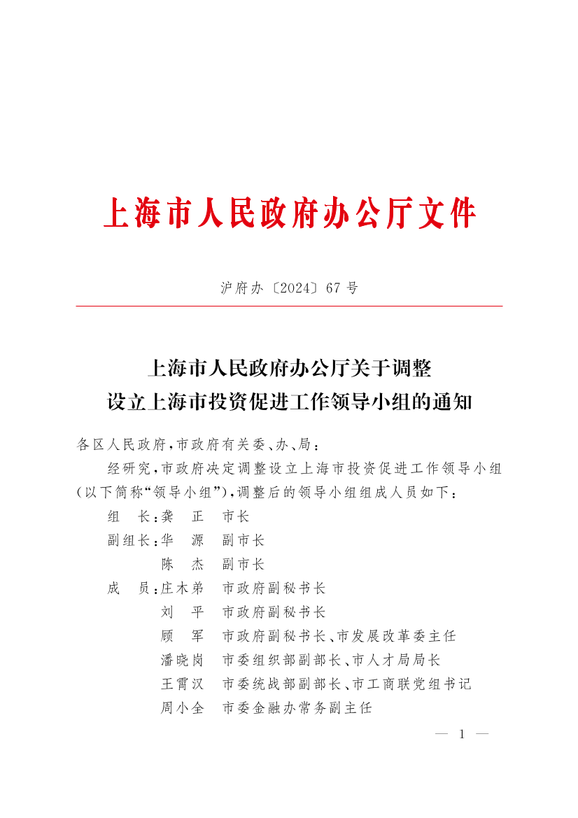 上海市人民政府辦公廳關(guān)于調(diào)整設(shè)立上海市投資促進(jìn)工作領(lǐng)導(dǎo)小組的通知